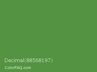Decimal 88568197 Color is a normal green color and the nearest color is May Green #4c9141. Hex code #539341 and RGB value is rgb(83,147,65). In RGB color space, this color is composed of 33% red, 58% green, 25% blue, In CMYK color space, this color is composed of 44% cyan, 0% magenta, 56% yellow , 42% black , In HSL color space, this color has a hue angle of 107° , 39% saturation and 42% lightness.