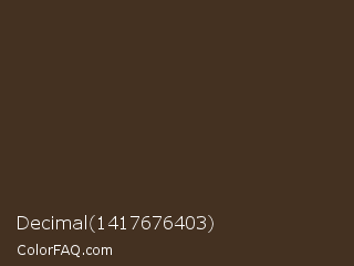 Decimal 1417676403 Color is a very dark orange color and the nearest color is Iroko #433120. Hex code #443121 and RGB value is rgb(68,49,33). In RGB color space, this color is composed of 27% red, 19% green, 13% blue, In CMYK color space, this color is composed of 0% cyan, 28% magenta, 51% yellow , 73% black , In HSL color space, this color has a hue angle of 27° , 35% saturation and 20% lightness.