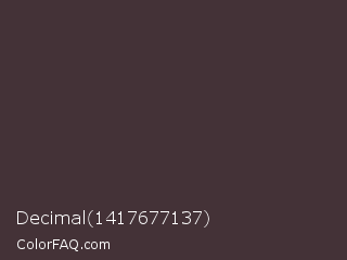 Decimal 1417677137 Color is a dark rose color and the nearest color is Woody Brown #483131. Hex code #443237 and RGB value is rgb(68,50,55). In RGB color space, this color is composed of 27% red, 20% green, 22% blue, In CMYK color space, this color is composed of 0% cyan, 26% magenta, 19% yellow , 73% black , In HSL color space, this color has a hue angle of 343° , 15% saturation and 23% lightness.