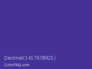 Decimal 1417678921 Color is a normal indigo color and the nearest color is Blue Pigment #333399. Hex code #443299 and RGB value is rgb(68,50,153). In RGB color space, this color is composed of 27% red, 20% green, 60% blue, In CMYK color space, this color is composed of 56% cyan, 67% magenta, 0% yellow , 40% black , In HSL color space, this color has a hue angle of 250° , 51% saturation and 40% lightness.