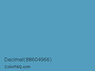 Decimal 88604966 Color is a normal blue color and the nearest color is Hippie Blue #589aaf. Hex code #539ebe and RGB value is rgb(83,158,190). In RGB color space, this color is composed of 33% red, 62% green, 75% blue, In CMYK color space, this color is composed of 56% cyan, 17% magenta, 0% yellow , 25% black , In HSL color space, this color has a hue angle of 198° , 45% saturation and 54% lightness.