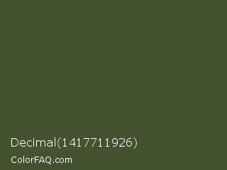 Decimal 1417711926 Color is a dark green color and the nearest color is Rifle Green #444c38. Hex code #445230 and RGB value is rgb(68,82,48). In RGB color space, this color is composed of 27% red, 32% green, 19% blue, In CMYK color space, this color is composed of 17% cyan, 0% magenta, 41% yellow , 68% black , In HSL color space, this color has a hue angle of 85° , 26% saturation and 25% lightness.