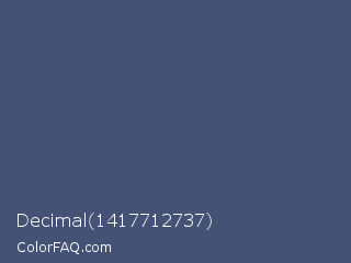 Decimal 1417712737 Color is a normal blue color and the nearest color is East Bay #414c7d. Hex code #445375 and RGB value is rgb(68,83,117). In RGB color space, this color is composed of 27% red, 33% green, 46% blue, In CMYK color space, this color is composed of 42% cyan, 29% magenta, 0% yellow , 54% black , In HSL color space, this color has a hue angle of 222° , 26% saturation and 36% lightness.