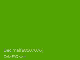 Decimal 88607076 Color is a normal green color and the nearest color is Christi #67a712. Hex code #53a204 and RGB value is rgb(83,162,4). In RGB color space, this color is composed of 33% red, 64% green, 2% blue, In CMYK color space, this color is composed of 49% cyan, 0% magenta, 98% yellow , 36% black , In HSL color space, this color has a hue angle of 90° , 95% saturation and 33% lightness.
