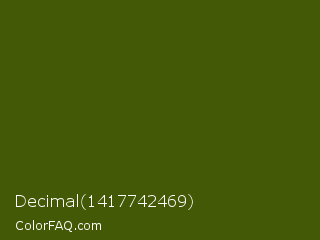 Decimal 1417742469 Color is a very dark lime color and the nearest color is Verdun Green #495400. Hex code #445905 and RGB value is rgb(68,89,5). In RGB color space, this color is composed of 27% red, 35% green, 2% blue, In CMYK color space, this color is composed of 24% cyan, 0% magenta, 94% yellow , 65% black , In HSL color space, this color has a hue angle of 75° , 89% saturation and 18% lightness.