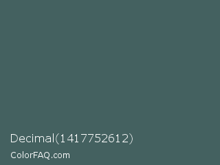 Decimal 1417752612 Color is a normal cyan color and the nearest color is Deep Space Sparkle #4a646c. Hex code #446160 and RGB value is rgb(68,97,96). In RGB color space, this color is composed of 27% red, 38% green, 38% blue, In CMYK color space, this color is composed of 30% cyan, 0% magenta, 1% yellow , 62% black , In HSL color space, this color has a hue angle of 178° , 18% saturation and 32% lightness.