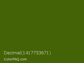 Decimal 1417753671 Color is a very dark green color and the nearest color is Green Leaf #436a0d. Hex code #446307 and RGB value is rgb(68,99,7). In RGB color space, this color is composed of 27% red, 39% green, 3% blue, In CMYK color space, this color is composed of 31% cyan, 0% magenta, 93% yellow , 61% black , In HSL color space, this color has a hue angle of 80° , 87% saturation and 21% lightness.