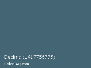 Decimal 1417756775 Color is a normal blue color and the nearest color is Blue Bayoux #496679. Hex code #446573 and RGB value is rgb(68,101,115). In RGB color space, this color is composed of 27% red, 40% green, 45% blue, In CMYK color space, this color is composed of 41% cyan, 12% magenta, 0% yellow , 55% black , In HSL color space, this color has a hue angle of 198° , 26% saturation and 36% lightness.