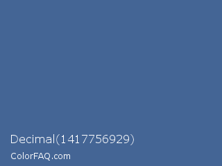 Decimal 1417756929 Color is a normal blue color and the nearest color is Queen Blue #436b95. Hex code #446595 and RGB value is rgb(68,101,149). In RGB color space, this color is composed of 27% red, 40% green, 58% blue, In CMYK color space, this color is composed of 54% cyan, 32% magenta, 0% yellow , 42% black , In HSL color space, this color has a hue angle of 216° , 37% saturation and 43% lightness.