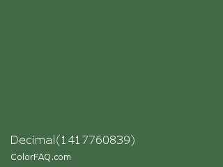 Decimal 1417760839 Color is a normal green color and the nearest color is Killarney #3a6a47. Hex code #446947 and RGB value is rgb(68,105,71). In RGB color space, this color is composed of 27% red, 41% green, 28% blue, In CMYK color space, this color is composed of 35% cyan, 0% magenta, 32% yellow , 59% black , In HSL color space, this color has a hue angle of 125° , 21% saturation and 34% lightness.