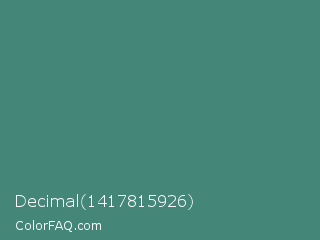 Decimal 1417815926 Color is a normal cyan color and the nearest color is Viridian #40826d. Hex code #448778 and RGB value is rgb(68,135,120). In RGB color space, this color is composed of 27% red, 53% green, 47% blue, In CMYK color space, this color is composed of 50% cyan, 0% magenta, 11% yellow , 47% black , In HSL color space, this color has a hue angle of 167° , 33% saturation and 40% lightness.