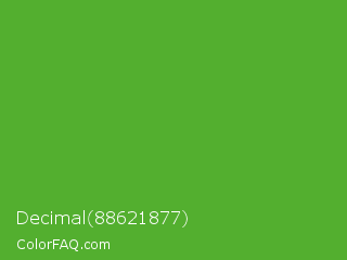 Decimal 88621877 Color is a normal green color and the nearest color is Apple #4fa83d. Hex code #53af2f and RGB value is rgb(83,175,47). In RGB color space, this color is composed of 33% red, 69% green, 18% blue, In CMYK color space, this color is composed of 53% cyan, 0% magenta, 73% yellow , 31% black , In HSL color space, this color has a hue angle of 103° , 58% saturation and 44% lightness.