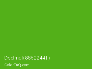 Decimal 88622441 Color is a normal green color and the nearest color is Kelly Green #4cbb17. Hex code #53b019 and RGB value is rgb(83,176,25). In RGB color space, this color is composed of 33% red, 69% green, 10% blue, In CMYK color space, this color is composed of 53% cyan, 0% magenta, 86% yellow , 31% black , In HSL color space, this color has a hue angle of 97° , 75% saturation and 39% lightness.