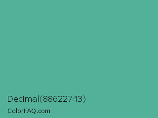 Decimal 88622743 Color is a normal cyan color and the nearest color is Polished Pine #5da493. Hex code #53b099 and RGB value is rgb(83,176,153). In RGB color space, this color is composed of 33% red, 69% green, 60% blue, In CMYK color space, this color is composed of 53% cyan, 0% magenta, 13% yellow , 31% black , In HSL color space, this color has a hue angle of 165° , 37% saturation and 51% lightness.