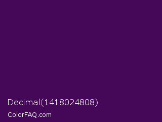 Decimal 1418024808 Color is a very dark purple color and the nearest color is Clairvoyant #480656. Hex code #450858 and RGB value is rgb(69,8,88). In RGB color space, this color is composed of 27% red, 3% green, 35% blue, In CMYK color space, this color is composed of 22% cyan, 91% magenta, 0% yellow , 65% black , In HSL color space, this color has a hue angle of 286° , 83% saturation and 19% lightness.