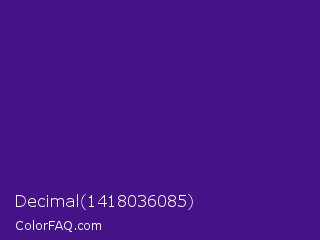 Decimal 1418036085 Color is a dark violet color and the nearest color is Pixie Powder #391285. Hex code #451287 and RGB value is rgb(69,18,135). In RGB color space, this color is composed of 27% red, 7% green, 53% blue, In CMYK color space, this color is composed of 49% cyan, 87% magenta, 0% yellow , 47% black , In HSL color space, this color has a hue angle of 266° , 76% saturation and 30% lightness.