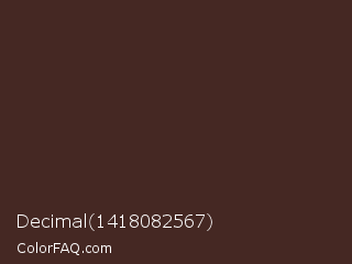 Decimal 1418082567 Color is a very dark red color and the nearest color is Crater Brown #462425. Hex code #452823 and RGB value is rgb(69,40,35). In RGB color space, this color is composed of 27% red, 16% green, 14% blue, In CMYK color space, this color is composed of 0% cyan, 42% magenta, 49% yellow , 73% black , In HSL color space, this color has a hue angle of 9° , 33% saturation and 20% lightness.
