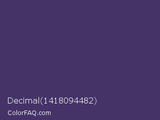 Decimal 1418094482 Color is a dark indigo color and the nearest color is Jacarta #3a2a6a. Hex code #453368 and RGB value is rgb(69,51,104). In RGB color space, this color is composed of 27% red, 20% green, 41% blue, In CMYK color space, this color is composed of 34% cyan, 51% magenta, 0% yellow , 59% black , In HSL color space, this color has a hue angle of 260° , 34% saturation and 30% lightness.