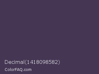 Decimal 1418098582 Color is a dark violet color and the nearest color is Gun Powder #414257. Hex code #453754 and RGB value is rgb(69,55,84). In RGB color space, this color is composed of 27% red, 22% green, 33% blue, In CMYK color space, this color is composed of 18% cyan, 35% magenta, 0% yellow , 67% black , In HSL color space, this color has a hue angle of 269° , 21% saturation and 27% lightness.