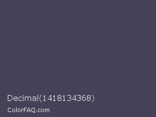 Decimal 1418134368 Color is a dark indigo color and the nearest color is Gun Powder #414257. Hex code #454158 and RGB value is rgb(69,65,88). In RGB color space, this color is composed of 27% red, 25% green, 35% blue, In CMYK color space, this color is composed of 22% cyan, 26% magenta, 0% yellow , 65% black , In HSL color space, this color has a hue angle of 250° , 15% saturation and 30% lightness.