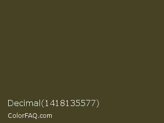 Decimal 1418135577 Color is a very dark yellow color and the nearest color is Lisbon Brown #423921. Hex code #454323 and RGB value is rgb(69,67,35). In RGB color space, this color is composed of 27% red, 26% green, 14% blue, In CMYK color space, this color is composed of 0% cyan, 3% magenta, 49% yellow , 73% black , In HSL color space, this color has a hue angle of 56° , 33% saturation and 20% lightness.