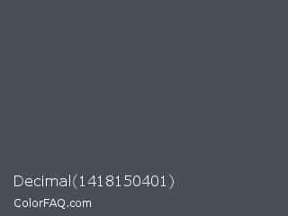 Decimal 1418150401 Color is a normal blue color and the nearest color is River Bed #434c59. Hex code #455059 and RGB value is rgb(69,80,89). In RGB color space, this color is composed of 27% red, 31% green, 35% blue, In CMYK color space, this color is composed of 22% cyan, 10% magenta, 0% yellow , 65% black , In HSL color space, this color has a hue angle of 207° , 13% saturation and 31% lightness.