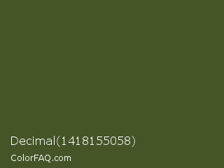 Decimal 1418155058 Color is a dark green color and the nearest color is Woodland #4d5328. Hex code #455528 and RGB value is rgb(69,85,40). In RGB color space, this color is composed of 27% red, 33% green, 16% blue, In CMYK color space, this color is composed of 19% cyan, 0% magenta, 53% yellow , 67% black , In HSL color space, this color has a hue angle of 81° , 36% saturation and 25% lightness.