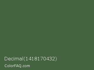 Decimal 1418170432 Color is a normal green color and the nearest color is Gray Asparagus #465945. Hex code #456340 and RGB value is rgb(69,99,64). In RGB color space, this color is composed of 27% red, 39% green, 25% blue, In CMYK color space, this color is composed of 30% cyan, 0% magenta, 35% yellow , 61% black , In HSL color space, this color has a hue angle of 111° , 21% saturation and 32% lightness.