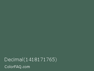 Decimal 1418171765 Color is a normal green color and the nearest color is Mineral Green #3f5d53. Hex code #456557 and RGB value is rgb(69,101,87). In RGB color space, this color is composed of 27% red, 40% green, 34% blue, In CMYK color space, this color is composed of 32% cyan, 0% magenta, 14% yellow , 60% black , In HSL color space, this color has a hue angle of 154° , 19% saturation and 33% lightness.