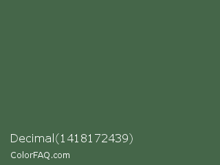 Decimal 1418172439 Color is a normal green color and the nearest color is Axolotl #4e6649. Hex code #456649 and RGB value is rgb(69,102,73). In RGB color space, this color is composed of 27% red, 40% green, 29% blue, In CMYK color space, this color is composed of 32% cyan, 0% magenta, 28% yellow , 60% black , In HSL color space, this color has a hue angle of 127° , 19% saturation and 34% lightness.