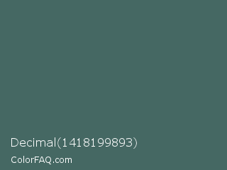 Decimal 1418199893 Color is a normal cyan color and the nearest color is Deep Space Sparkle #4a646c. Hex code #456863 and RGB value is rgb(69,104,99). In RGB color space, this color is composed of 27% red, 41% green, 39% blue, In CMYK color space, this color is composed of 34% cyan, 0% magenta, 5% yellow , 59% black , In HSL color space, this color has a hue angle of 171° , 20% saturation and 34% lightness.