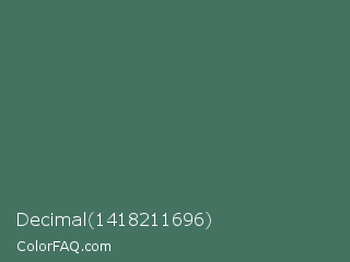 Decimal 1418211696 Color is a normal green color and the nearest color is Hookers Green #49796b. Hex code #457362 and RGB value is rgb(69,115,98). In RGB color space, this color is composed of 27% red, 45% green, 38% blue, In CMYK color space, this color is composed of 40% cyan, 0% magenta, 15% yellow , 55% black , In HSL color space, this color has a hue angle of 158° , 25% saturation and 36% lightness.