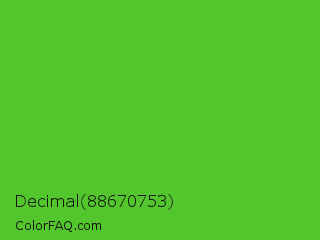 Decimal 88670753 Color is a normal green color and the nearest color is Harlequin Green #46cb18. Hex code #53c62d and RGB value is rgb(83,198,45). In RGB color space, this color is composed of 33% red, 78% green, 18% blue, In CMYK color space, this color is composed of 58% cyan, 0% magenta, 77% yellow , 22% black , In HSL color space, this color has a hue angle of 105° , 63% saturation and 48% lightness.