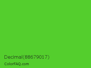 Decimal 88679017 Color is a normal green color and the nearest color is Harlequin Green #46cb18. Hex code #53ce2d and RGB value is rgb(83,206,45). In RGB color space, this color is composed of 33% red, 81% green, 18% blue, In CMYK color space, this color is composed of 60% cyan, 0% magenta, 78% yellow , 19% black , In HSL color space, this color has a hue angle of 106° , 64% saturation and 49% lightness.