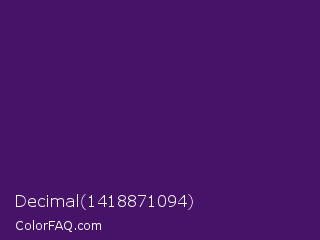 Decimal 1418871094 Color is a dark purple color and the nearest color is Scarlet Gum #431560. Hex code #461368 and RGB value is rgb(70,19,104). In RGB color space, this color is composed of 27% red, 7% green, 41% blue, In CMYK color space, this color is composed of 33% cyan, 82% magenta, 0% yellow , 59% black , In HSL color space, this color has a hue angle of 276° , 69% saturation and 24% lightness.