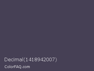 Decimal 1418942007 Color is a dark indigo color and the nearest color is Gun Powder #414257. Hex code #464055 and RGB value is rgb(70,64,85). In RGB color space, this color is composed of 27% red, 25% green, 33% blue, In CMYK color space, this color is composed of 18% cyan, 25% magenta, 0% yellow , 67% black , In HSL color space, this color has a hue angle of 257° , 14% saturation and 29% lightness.