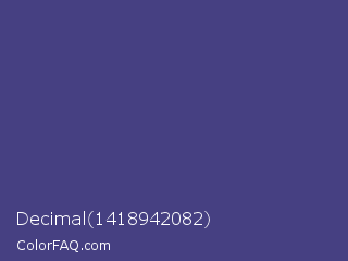 Decimal 1418942082 Color is a normal indigo color and the nearest color is Dark Slate Blue #483d8b. Hex code #464082 and RGB value is rgb(70,64,130). In RGB color space, this color is composed of 27% red, 25% green, 51% blue, In CMYK color space, this color is composed of 46% cyan, 51% magenta, 0% yellow , 49% black , In HSL color space, this color has a hue angle of 245° , 34% saturation and 38% lightness.