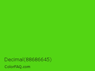 Decimal 88686645 Color is a normal green color and the nearest color is Harlequin Green #46cb18. Hex code #53d513 and RGB value is rgb(83,213,19). In RGB color space, this color is composed of 33% red, 84% green, 7% blue, In CMYK color space, this color is composed of 61% cyan, 0% magenta, 91% yellow , 16% black , In HSL color space, this color has a hue angle of 100° , 84% saturation and 45% lightness.