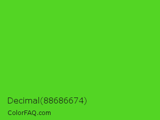 Decimal 88686674 Color is a normal green color and the nearest color is Harlequin Green #46cb18. Hex code #53d524 and RGB value is rgb(83,213,36). In RGB color space, this color is composed of 33% red, 84% green, 14% blue, In CMYK color space, this color is composed of 61% cyan, 0% magenta, 83% yellow , 16% black , In HSL color space, this color has a hue angle of 104° , 71% saturation and 49% lightness.