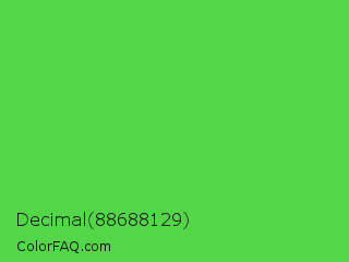 Decimal 88688129 Color is a normal green color and the nearest color is Lime Green #32cd32. Hex code #53d749 and RGB value is rgb(83,215,73). In RGB color space, this color is composed of 33% red, 84% green, 29% blue, In CMYK color space, this color is composed of 61% cyan, 0% magenta, 66% yellow , 16% black , In HSL color space, this color has a hue angle of 116° , 64% saturation and 56% lightness.