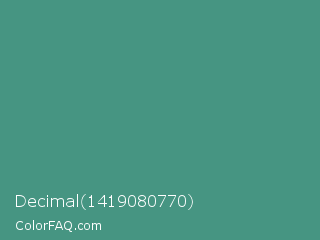 Decimal 1419080770 Color is a normal cyan color and the nearest color is Wintergreen Dream #56887d. Hex code #469582 and RGB value is rgb(70,149,130). In RGB color space, this color is composed of 27% red, 58% green, 51% blue, In CMYK color space, this color is composed of 53% cyan, 0% magenta, 13% yellow , 42% black , In HSL color space, this color has a hue angle of 166° , 36% saturation and 43% lightness.