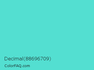 Decimal 88696709 Color is a normal cyan color and the nearest color is Medium Turquoise #48d1cc. Hex code #53dfd1 and RGB value is rgb(83,223,209). In RGB color space, this color is composed of 33% red, 87% green, 82% blue, In CMYK color space, this color is composed of 63% cyan, 0% magenta, 6% yellow , 13% black , In HSL color space, this color has a hue angle of 174° , 69% saturation and 60% lightness.