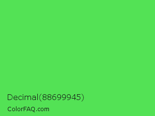 Decimal 88699945 Color is a light green color and the nearest color is Screamin Green #66ff66. Hex code #53e255 and RGB value is rgb(83,226,85). In RGB color space, this color is composed of 33% red, 89% green, 33% blue, In CMYK color space, this color is composed of 63% cyan, 0% magenta, 62% yellow , 11% black , In HSL color space, this color has a hue angle of 121° , 71% saturation and 61% lightness.