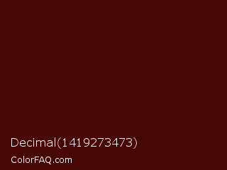 Decimal 1419273473 Color is a very dark red color and the nearest color is Bulgarian Rose #480607. Hex code #470705 and RGB value is rgb(71,7,5). In RGB color space, this color is composed of 28% red, 3% green, 2% blue, In CMYK color space, this color is composed of 0% cyan, 90% magenta, 93% yellow , 72% black , In HSL color space, this color has a hue angle of 2° , 87% saturation and 15% lightness.
