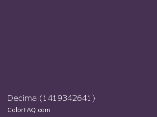 Decimal 1419342641 Color is a dark purple color and the nearest color is Bossanova #4e2a5a. Hex code #473153 and RGB value is rgb(71,49,83). In RGB color space, this color is composed of 28% red, 19% green, 33% blue, In CMYK color space, this color is composed of 14% cyan, 41% magenta, 0% yellow , 67% black , In HSL color space, this color has a hue angle of 279° , 26% saturation and 26% lightness.