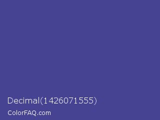 Decimal 1426071555 Color is a normal indigo color and the nearest color is Dark Slate Blue #483d8b. Hex code #474393 and RGB value is rgb(71,67,147). In RGB color space, this color is composed of 28% red, 26% green, 58% blue, In CMYK color space, this color is composed of 52% cyan, 54% magenta, 0% yellow , 42% black , In HSL color space, this color has a hue angle of 243° , 37% saturation and 42% lightness.