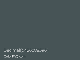 Decimal 1426088596 Color is a normal cyan color and the nearest color is Abbey #4c4f56. Hex code #475456 and RGB value is rgb(71,84,86). In RGB color space, this color is composed of 28% red, 33% green, 34% blue, In CMYK color space, this color is composed of 17% cyan, 2% magenta, 0% yellow , 66% black , In HSL color space, this color has a hue angle of 188° , 10% saturation and 31% lightness.