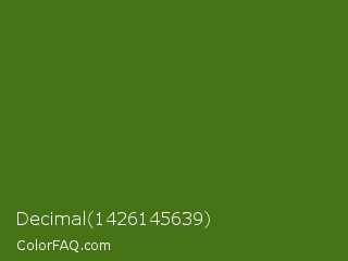 Decimal 1426145639 Color is a dark green color and the nearest color is Green Leaf #436a0d. Hex code #477317 and RGB value is rgb(71,115,23). In RGB color space, this color is composed of 28% red, 45% green, 9% blue, In CMYK color space, this color is composed of 38% cyan, 0% magenta, 80% yellow , 55% black , In HSL color space, this color has a hue angle of 89° , 67% saturation and 27% lightness.