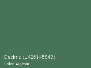 Decimal 1426145843 Color is a normal green color and the nearest color is Amazon #3b7a57. Hex code #477359 and RGB value is rgb(71,115,89). In RGB color space, this color is composed of 28% red, 45% green, 35% blue, In CMYK color space, this color is composed of 38% cyan, 0% magenta, 23% yellow , 55% black , In HSL color space, this color has a hue angle of 145° , 24% saturation and 36% lightness.