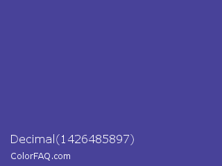 Decimal 1426485897 Color is a normal indigo color and the nearest color is Gigas #523c94. Hex code #484299 and RGB value is rgb(72,66,153). In RGB color space, this color is composed of 28% red, 26% green, 60% blue, In CMYK color space, this color is composed of 53% cyan, 57% magenta, 0% yellow , 40% black , In HSL color space, this color has a hue angle of 244° , 40% saturation and 43% lightness.